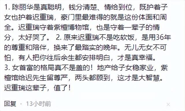 “夙昔以为迟重瑞配不上陈丽华,当今发现,能找到一个鞭策为你放手名利、守36年端正、在你走后去寺庙为你诵经的男东说念主,才是果然的福泽。”